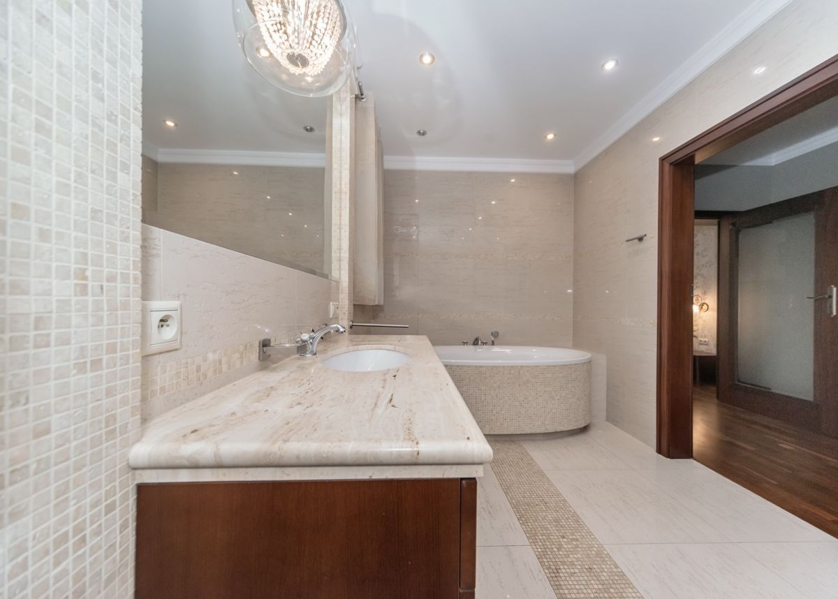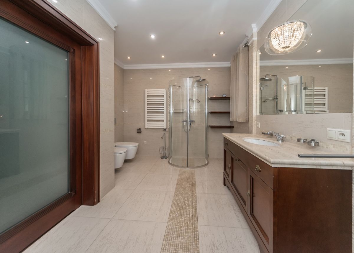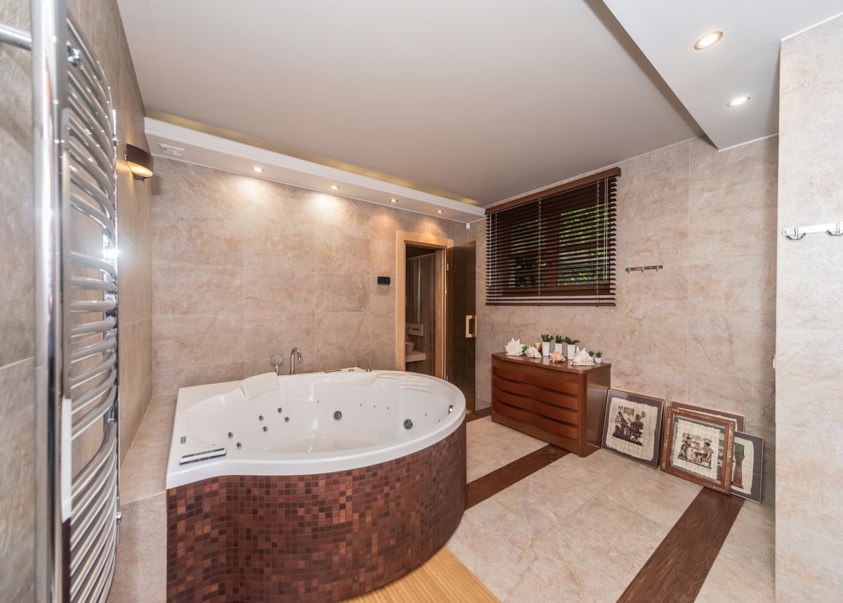 W przyziemiu (powierzchnia 72,65 m2) znajduje się pokój z łazienką i wc - część dla gosposi, która jest połączona schodami z wyjściem w kuchni, sauna z łazienką w której znajduje się jacuzzi, mini siłownia - część rekreacyjna, pralnia, piwnica.