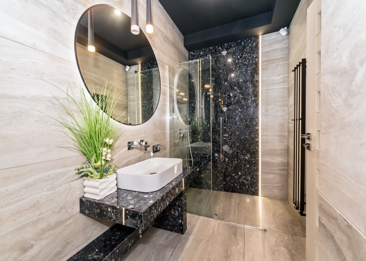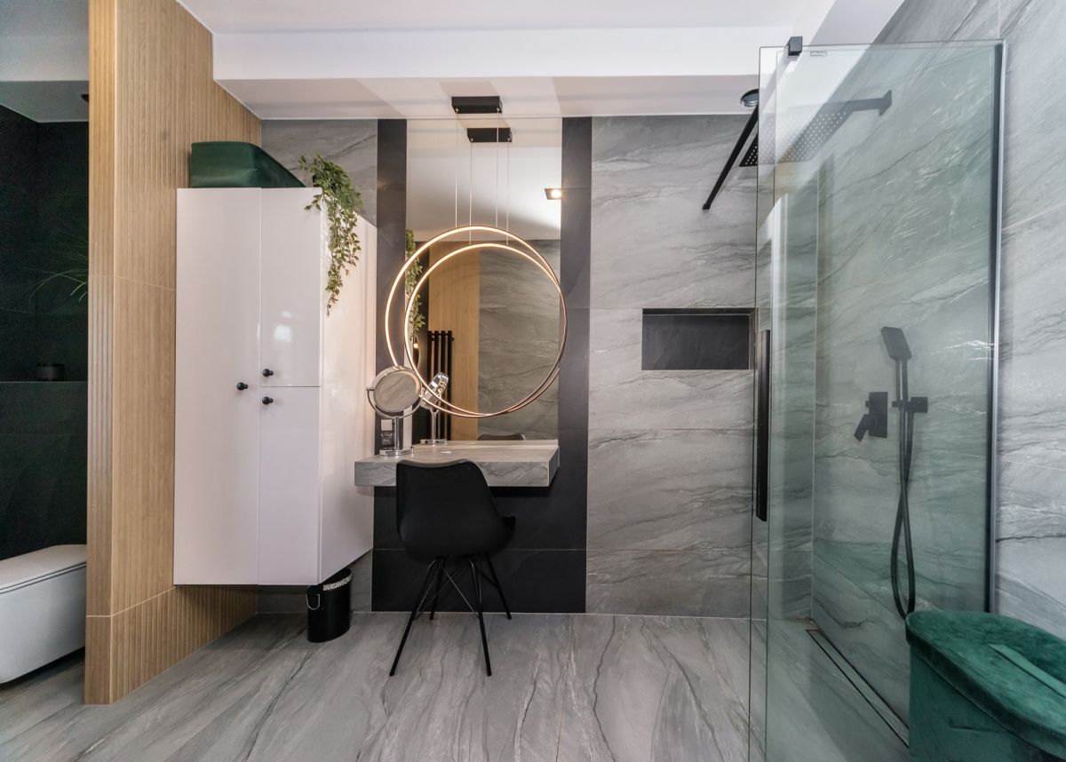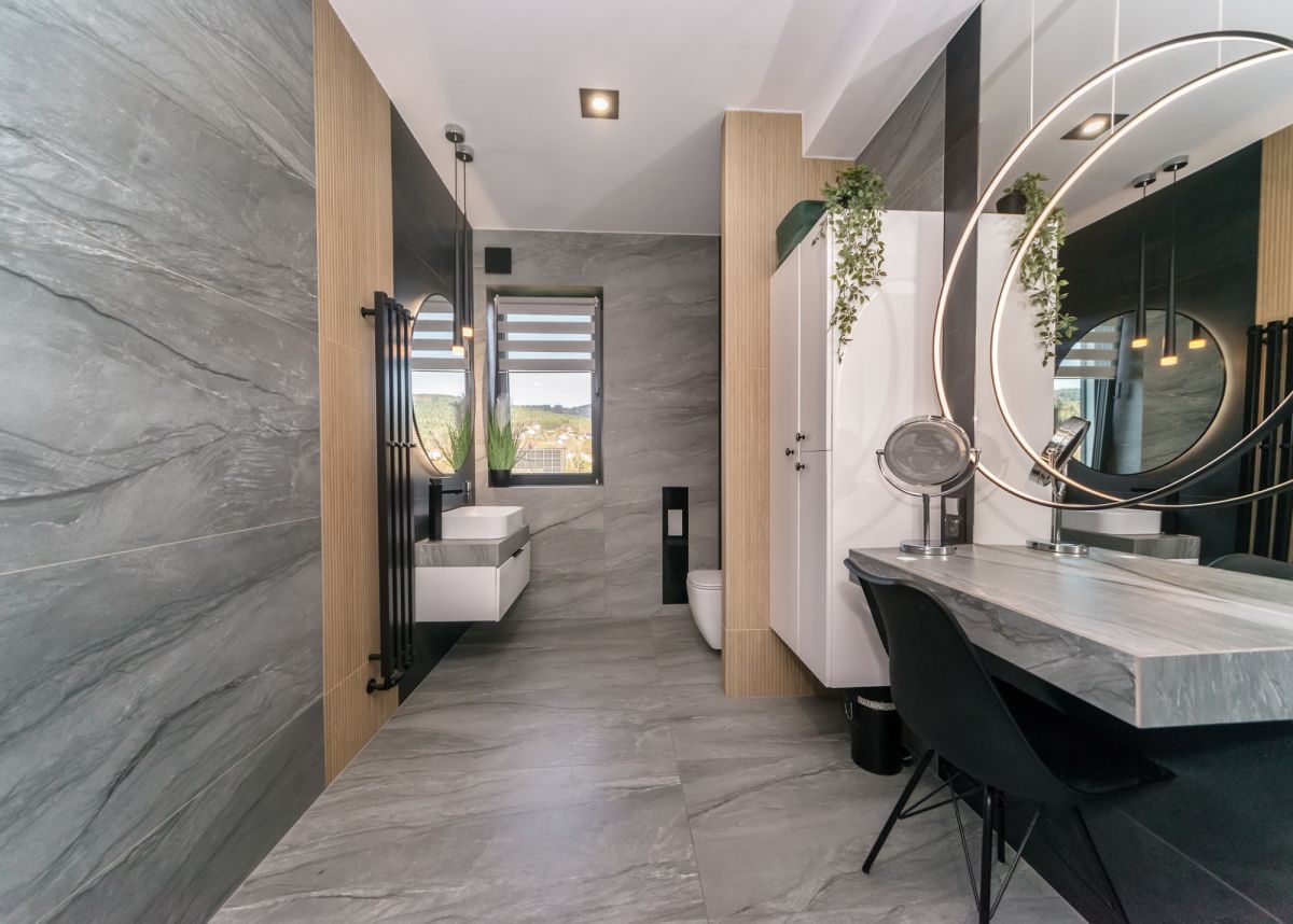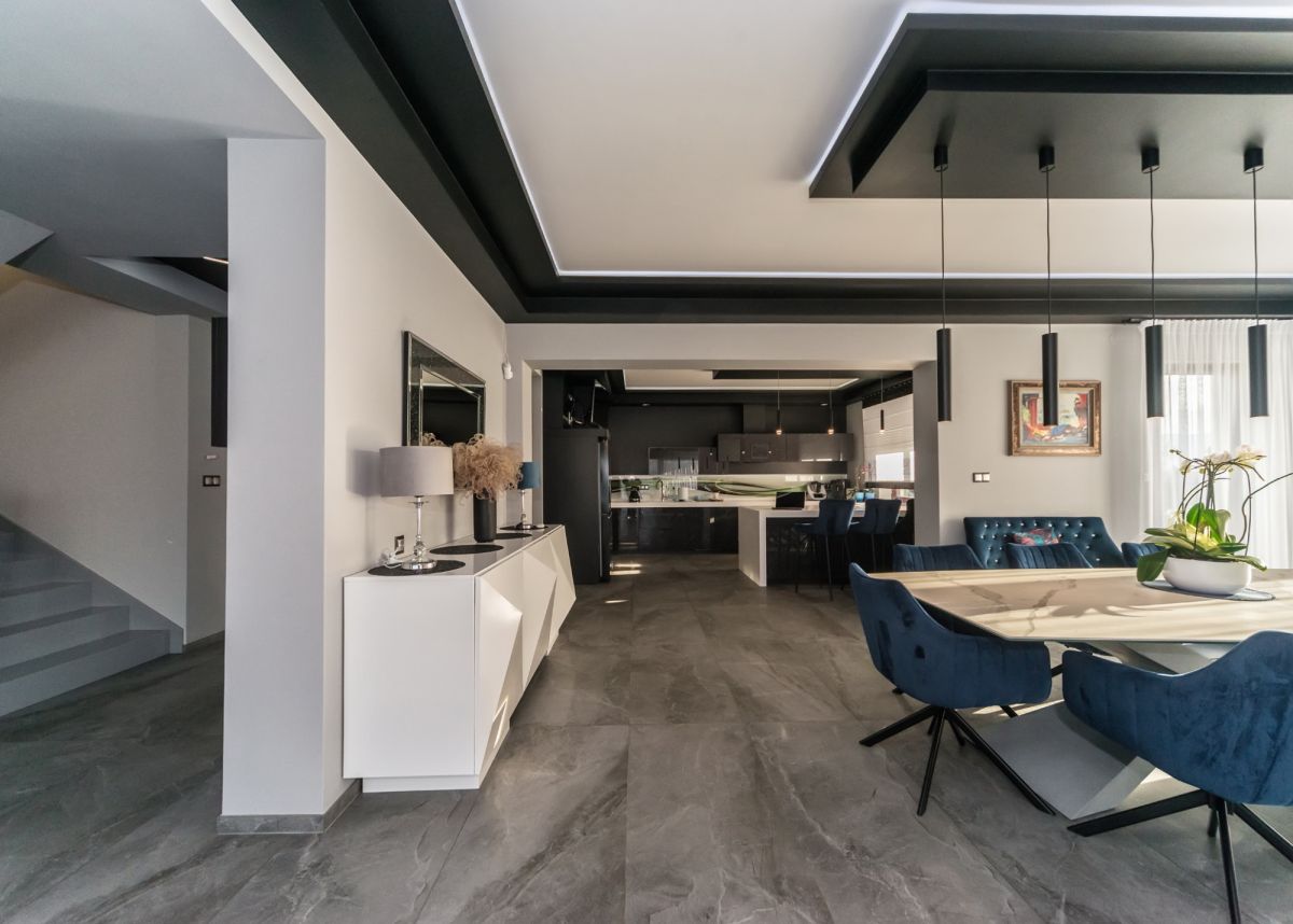 Parter domu, to komfortowa przestrzeń o pow. 280 mkw, gdzie znajduje się przestronny salon z kominkiem, duże okna z widokiem na ogród i góry, jadalnia z otwartą kuchnią (z pomieszczeń wyjście na taras) łazienka, obok mieści się główna sypialnia z garderobą i łazienką, następnie pralnia, garderoba, pełna łazienka oraz przedpokój z wejściem do dwustanowiskowego garażu o pow. 90 m2 i pomieszczeń gospodarczych.