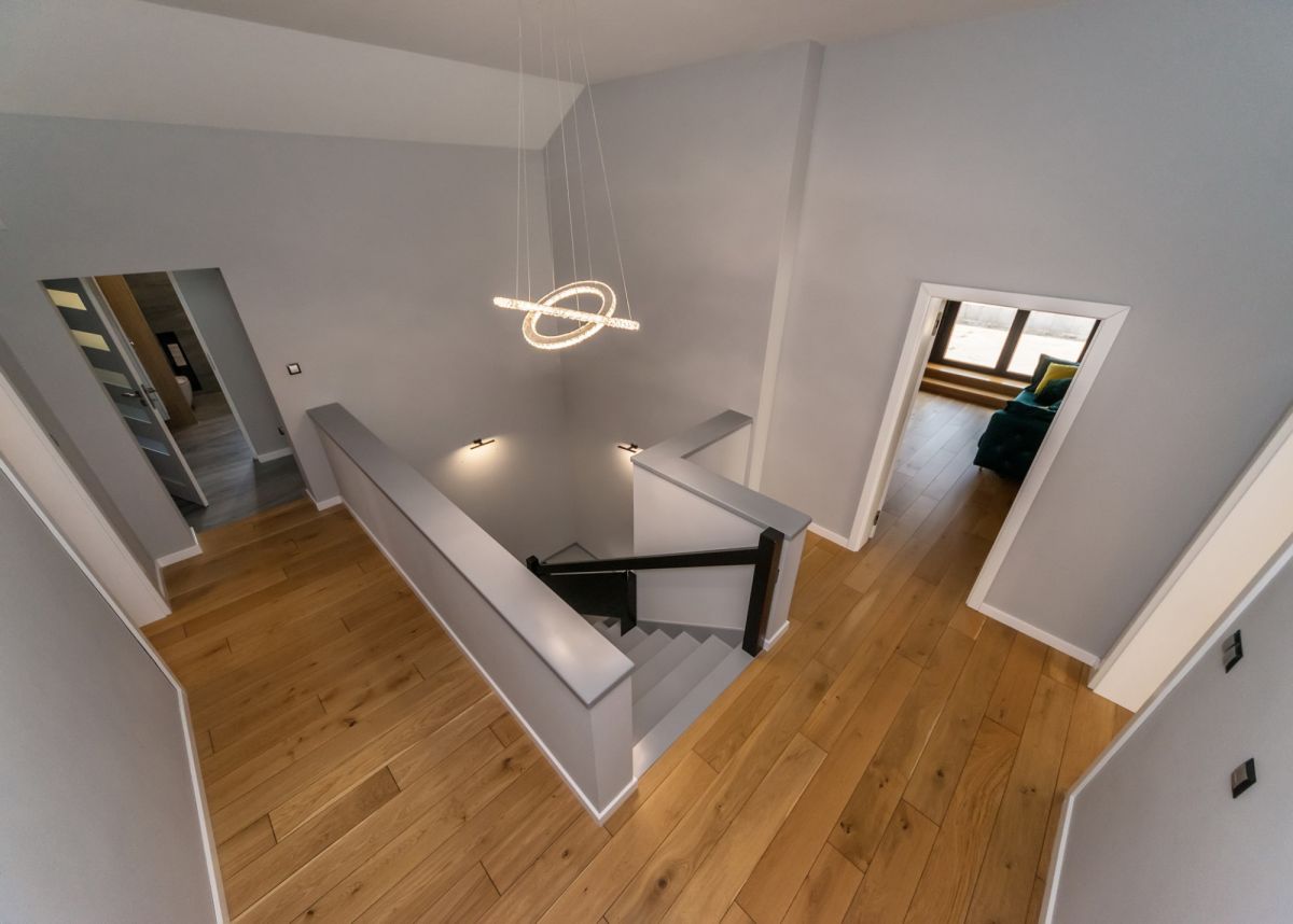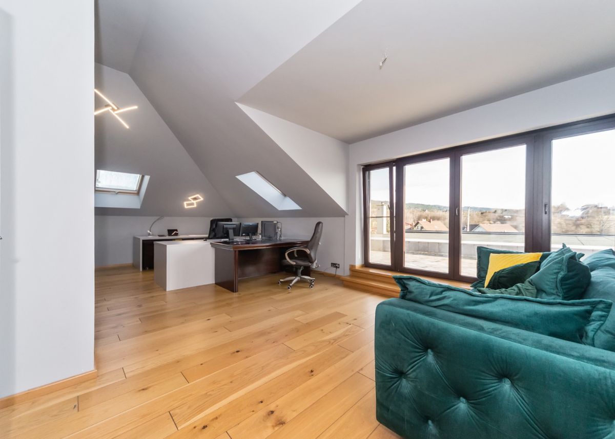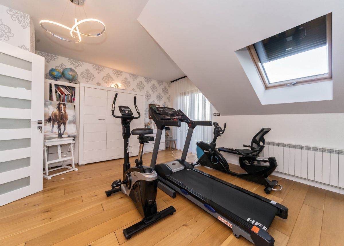 Na piętrze (powierzchnia 142 mkw) znajdują się 2 sypialnie z balkonami, przestronny gabinet z wyjściem na taras, pokój-siłownia, 2 pełne łazienki oraz garderoba.