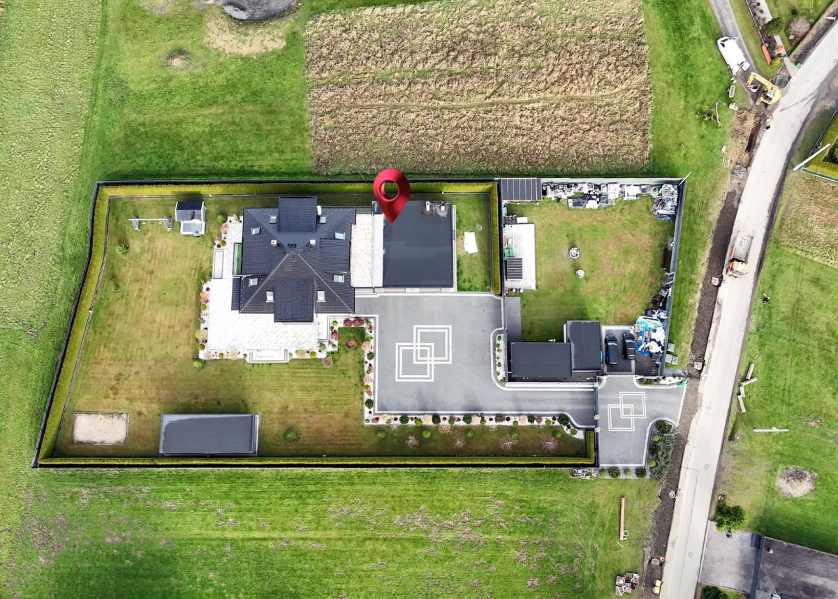 Parterowy budynek z użytkowym poddaszem o łącznej powierzchni użytkowej 422 mkw, posadowiony na bardzo dobrze nasłonecznionej działce o powierzchni 4230 mkw, w pełni zagospodarowanej, z wolnostojącą altanką i pomieszczeniami gospodarczymi, ogrodzonej z elektrycznie otwieraną bramą dwuskrzydłową, wybrukowany podjazd dla samochodów (pow. 800 mkw.)