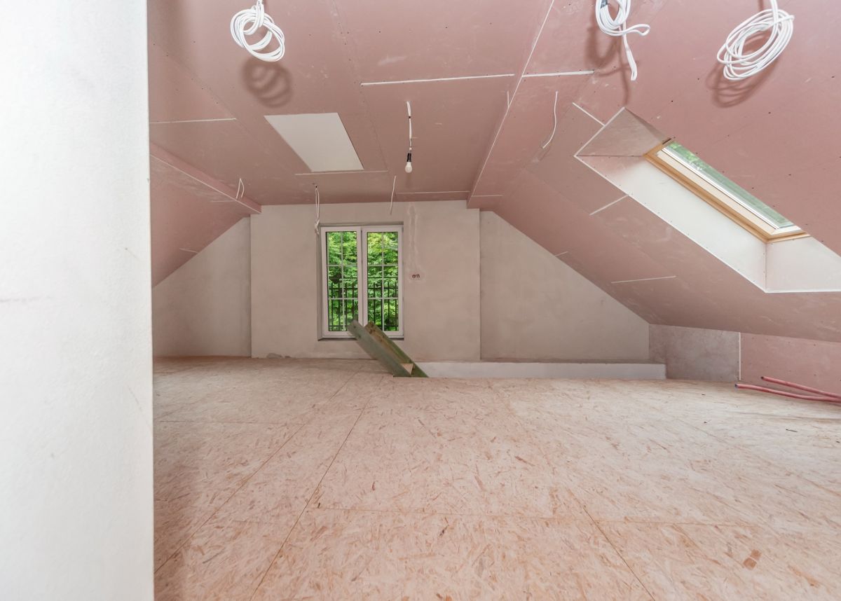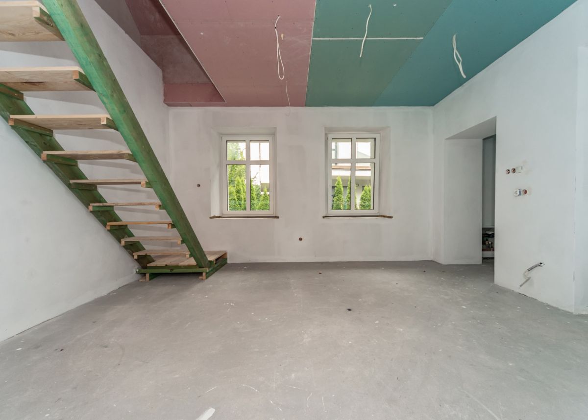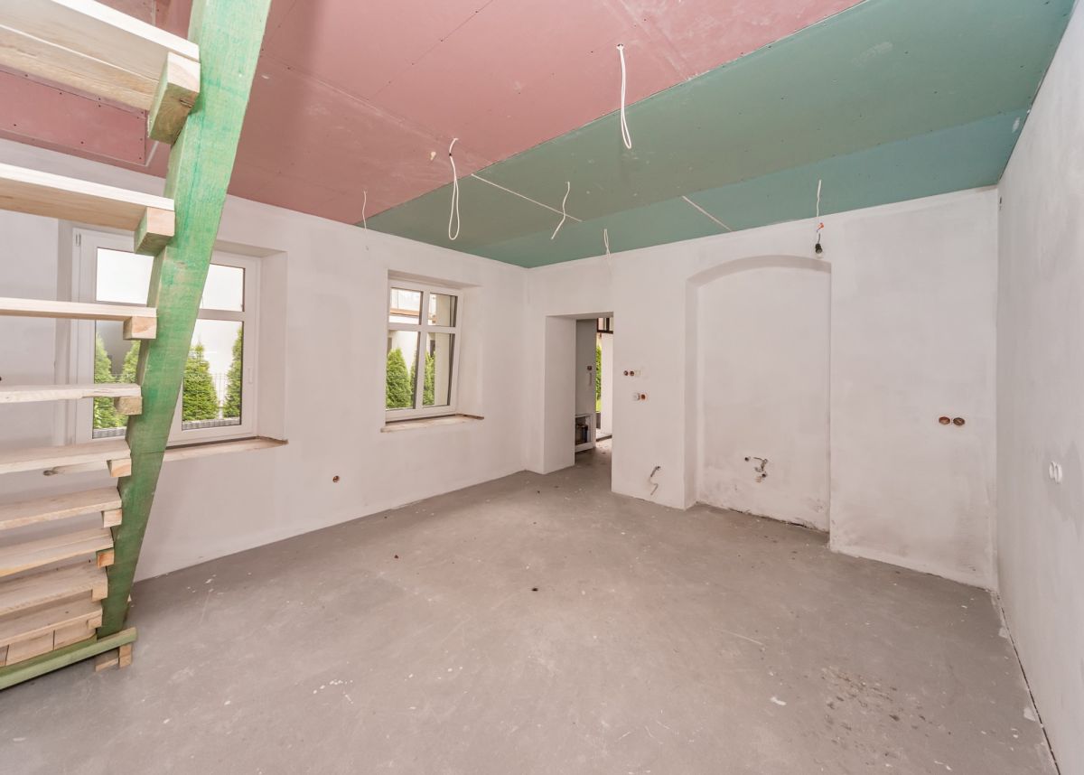 Budynek po generalnym remoncie, nowa więźba, dach, ściany skute do cegły i przykryte nowymi tynkami, nowe wylewki, wszystkie instalacje, okna, gdyby nie mury z cegły, można by powiedzieć, że postawiono go od nowa.