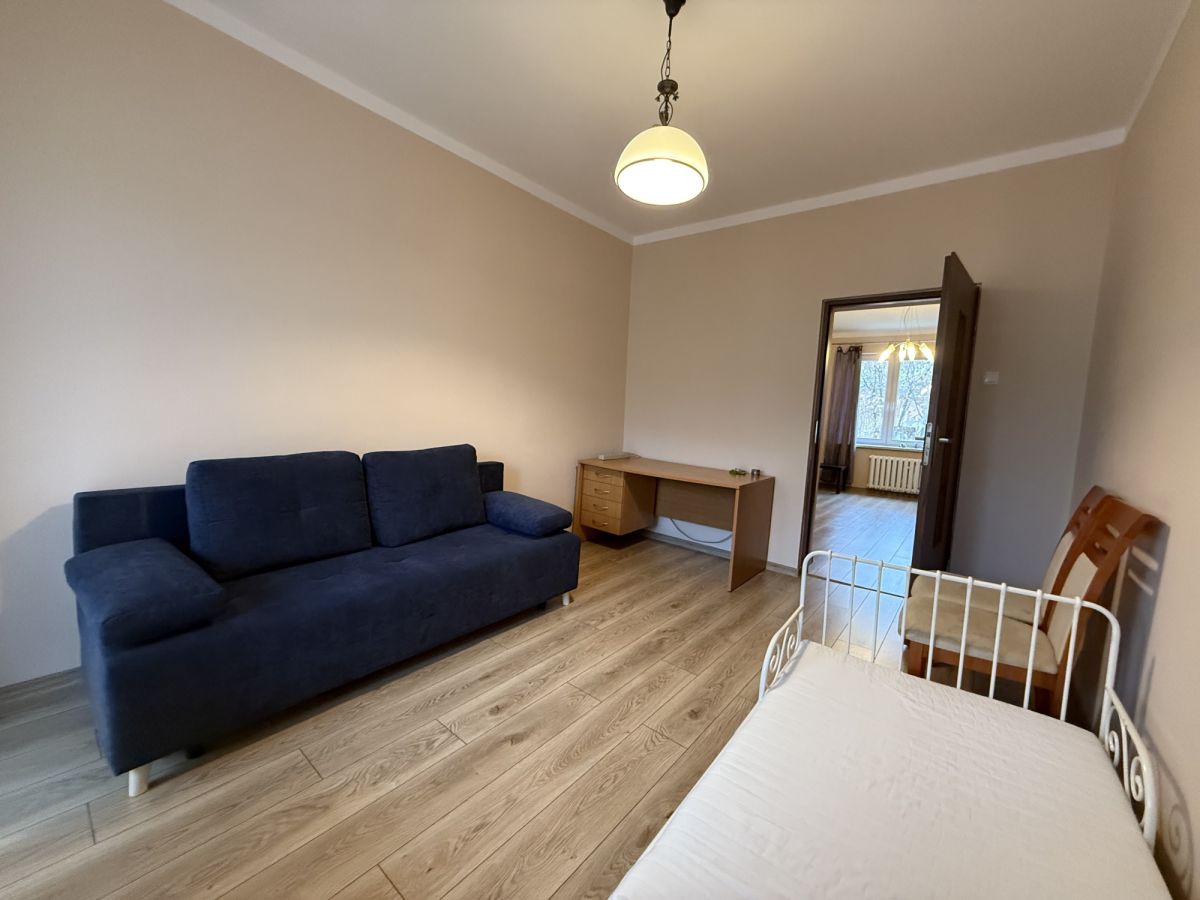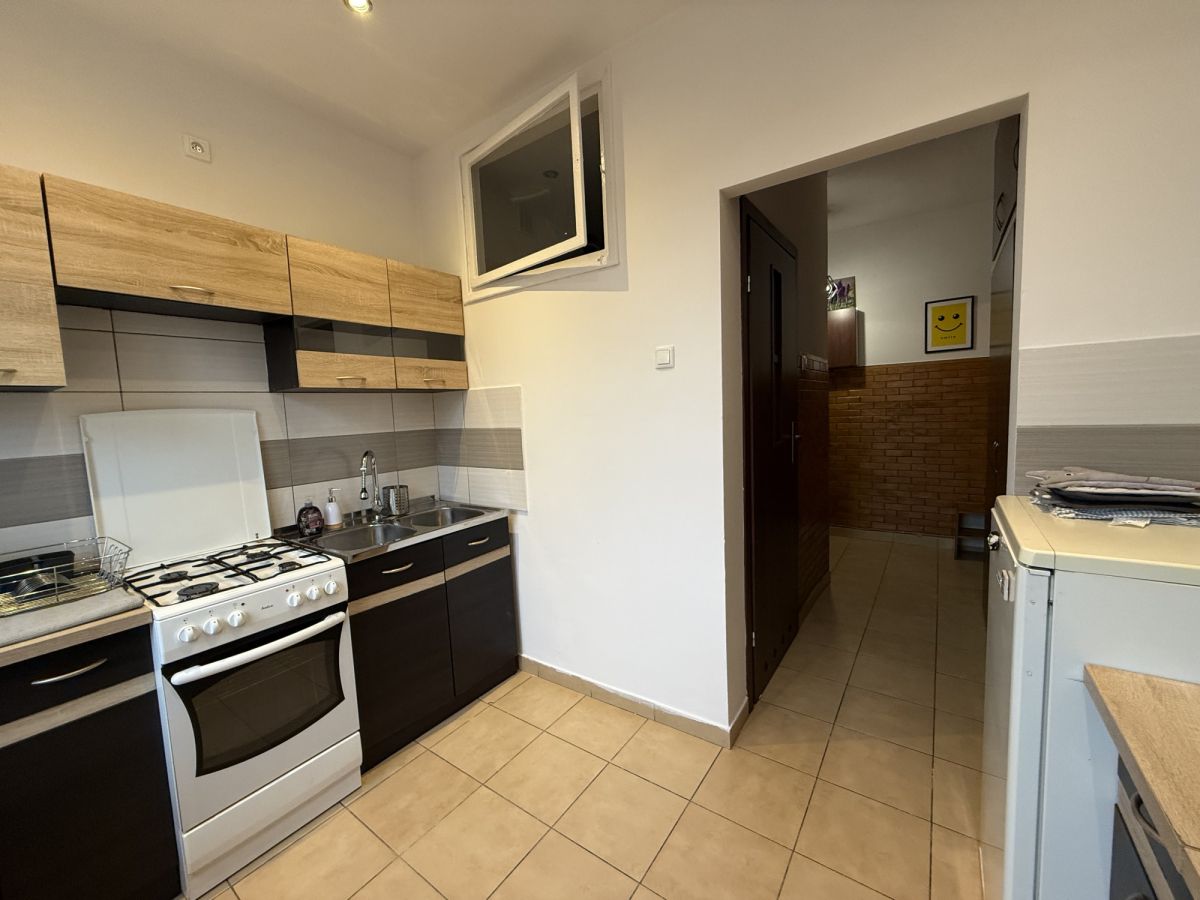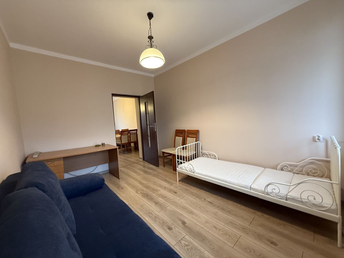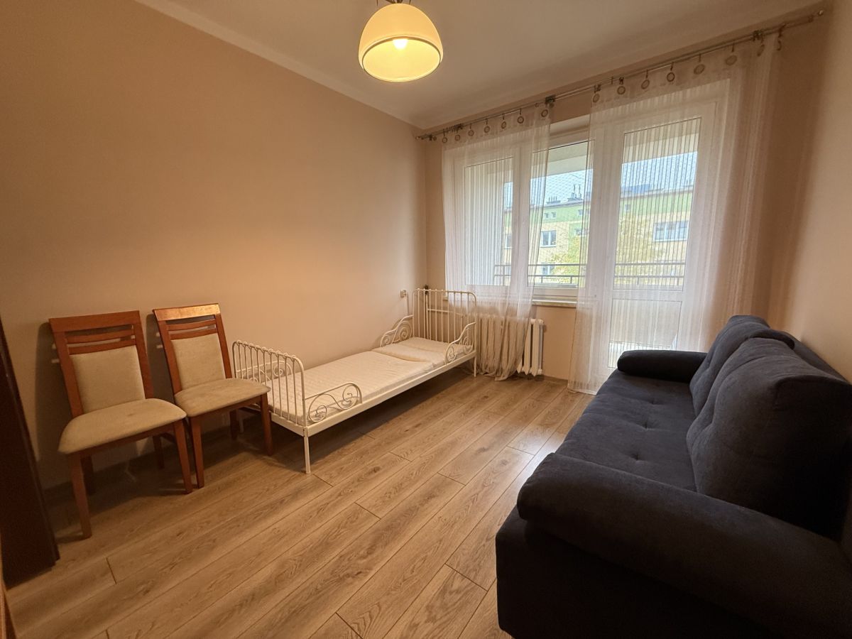 Mieszkanie mieści się na III piętrze III piętrowego bloku. Przedpokój z szafą zabudowaną, łazienka z kabiną prysznicową, wc i pralką, umeblowana kuchnia, dwa pokoje przejściowe - umeblowane, z mniejszego pokoju wyjście na balkon.