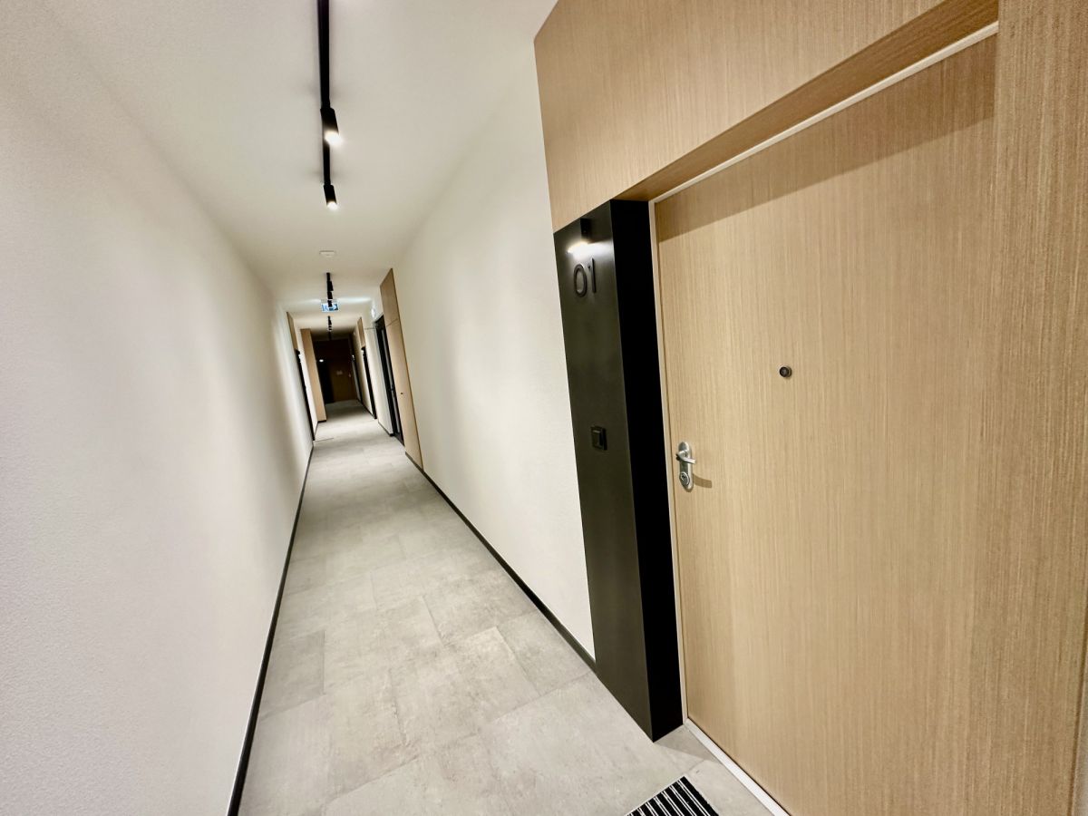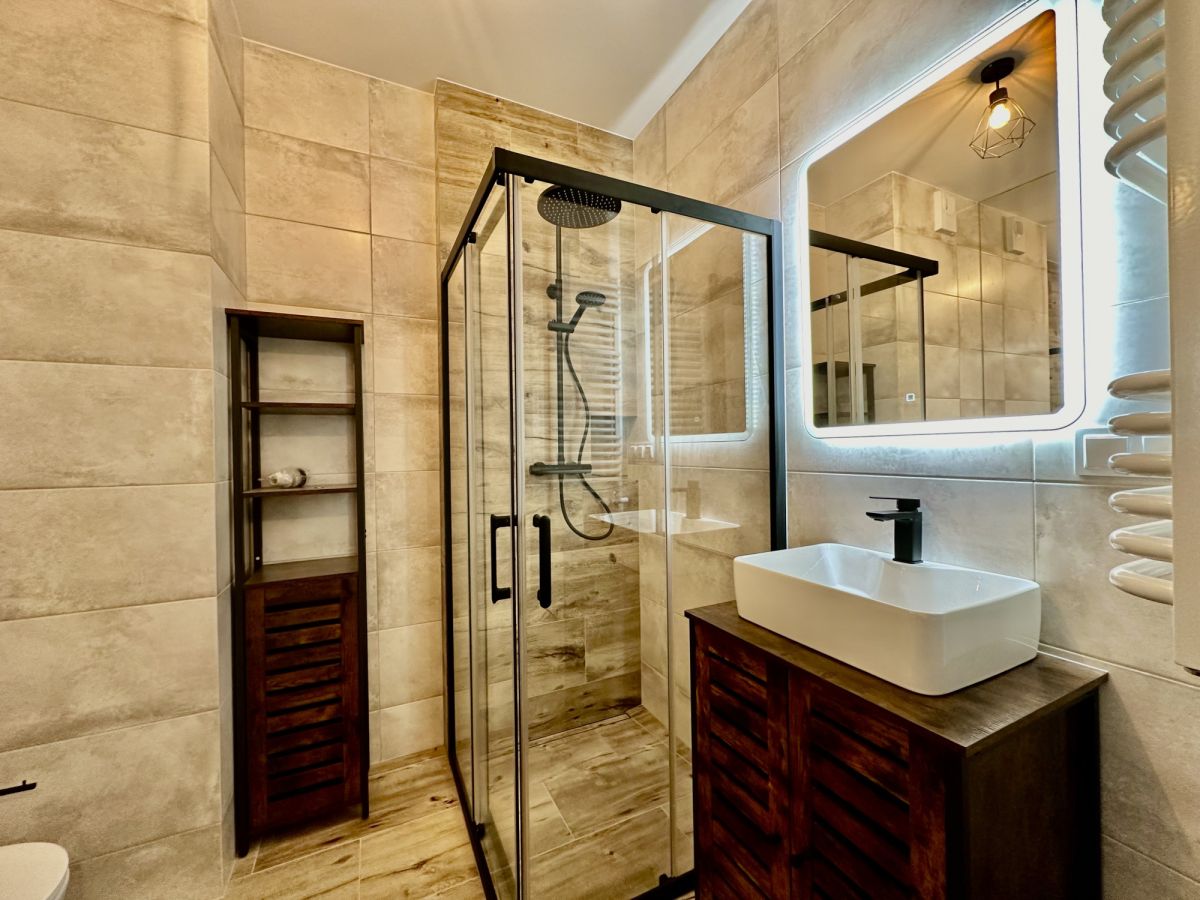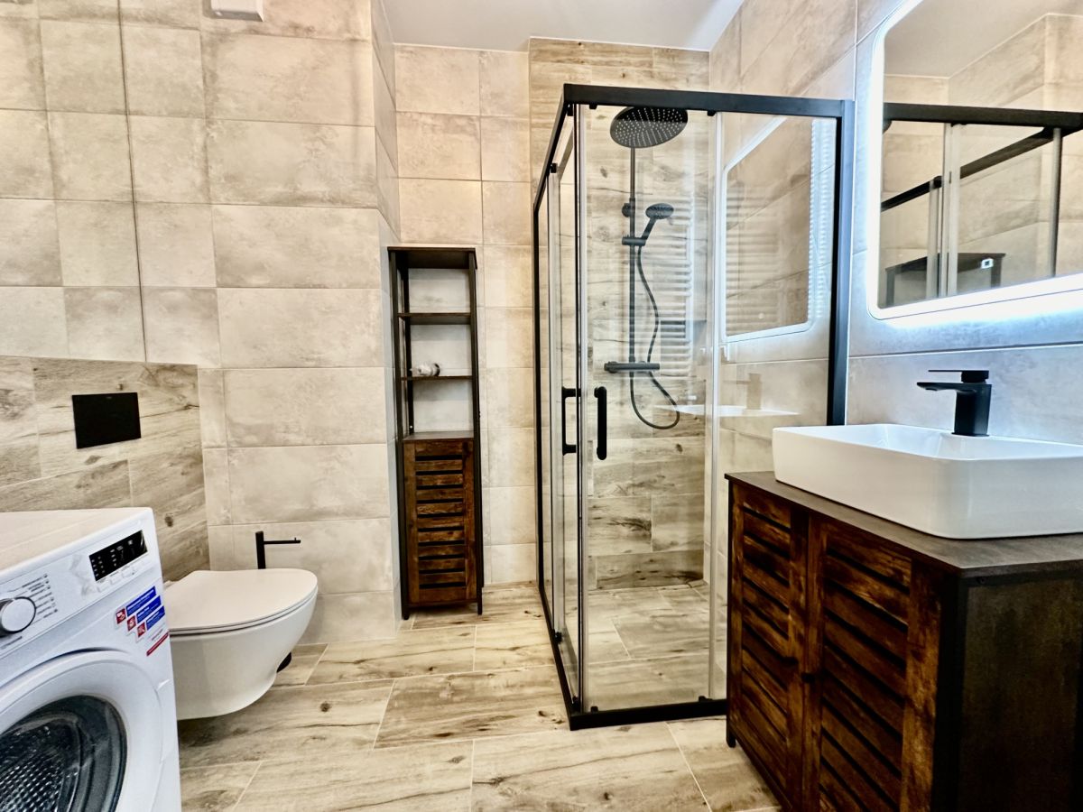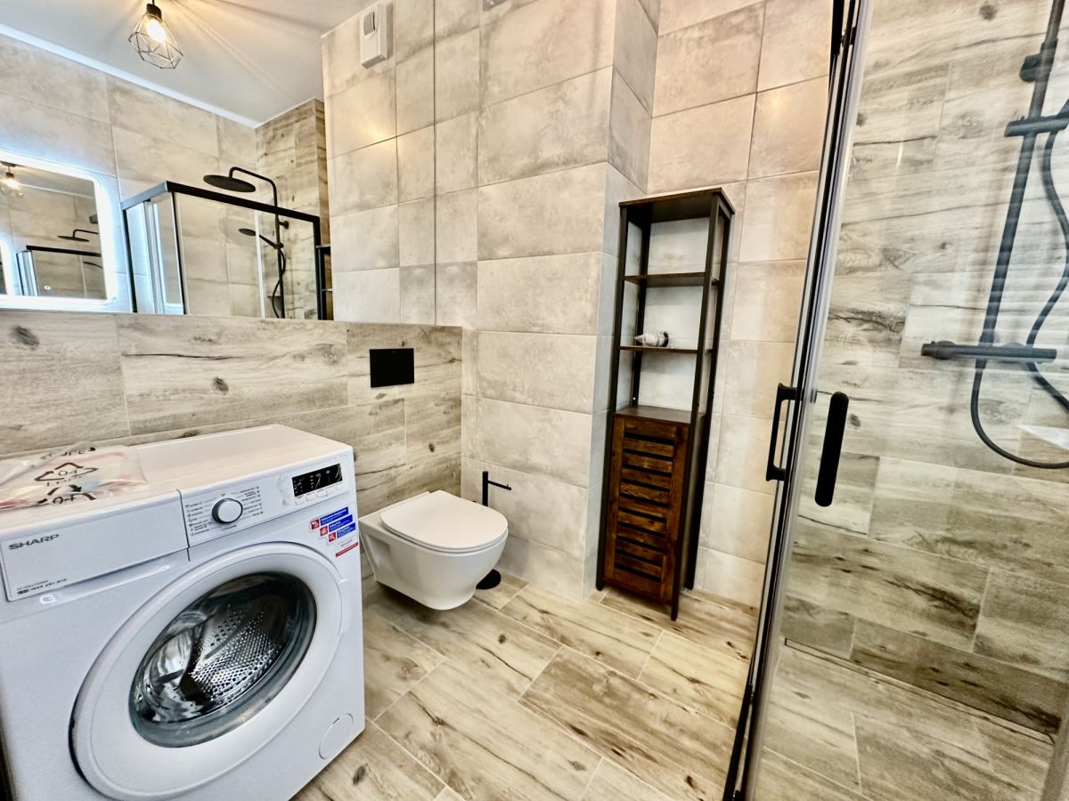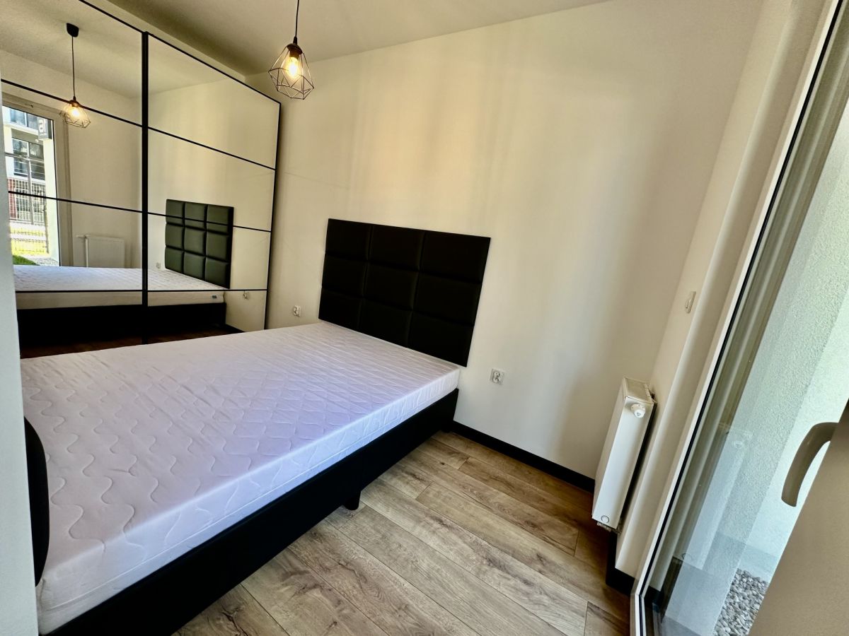 Mieszkanie składa się z salonu z aneksem kuchennym, wydzielonej części sypialni z szafą zabudowaną, łazienki z kabiną prysznicową i wc. Duże okno balkonowe w sypialni oraz tarasowe w salonie. W oknach rolety elektryczne.